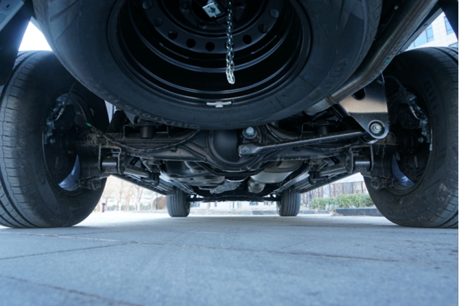從曝光的底盤圖片來看,新車采用前雙叉臂+后多連桿整體橋懸架,構成一副十分強悍的硬派越野骨架,帶來了更好的通過性。