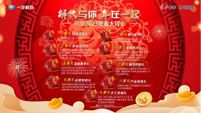 紅日高照迎新春,喜花常開幸福年。2023年1月9日,“解放與你 年在一起——解放2023新春大拜年”迎著新年的號角如期而來。本次活動在解放官微、抖音、快手、解放行、卡車之家、卡車e族、中國卡車網等全網平臺進行重磅直播,將滿滿的福利與濃濃的祝福,送給在線觀看的55萬觀眾和未能觀看直播的每一位解放用戶。
