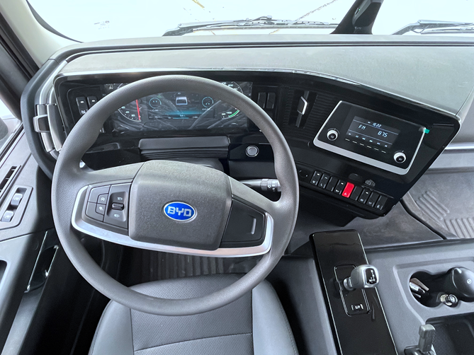 進(jìn)入駕駛室,可以看到比亞迪Q3純電動(dòng)牽引車的駕駛室采用了環(huán)繞式儀表臺(tái),多功能方向盤抓握感非常貼合手掌,儀表盤采用了機(jī)械指針加8寸液晶顯示屏的設(shè)計(jì),顯示信息簡潔明了,能讓駕駛員及時(shí)掌握車輛動(dòng)態(tài)信息。而且,中控臺(tái)功能按鍵觸手可及,充分詮釋了“以駕駛者為中心”。另外,這款車還能選裝PAD系統(tǒng),10.1英寸的高清大屏等多種功能。