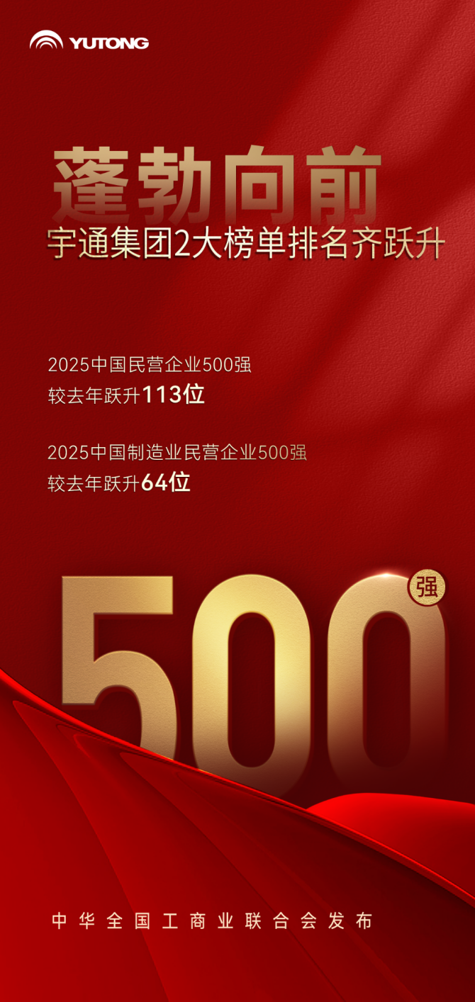 8月28日,全國工商聯發布“2025中國民營企業500強”及“2025中國制造業民營企業500強”兩項榜單,憑借2024年優異的經營表現,宇通集團榮登雙榜并實現排名大幅躍升。其中,在“2025中國民營企業500強”榜單中,宇通排名第279位,較去年躍升113位,在“2025中國制造業民營企業500強”榜單中排名第200位,較去年躍升64位。