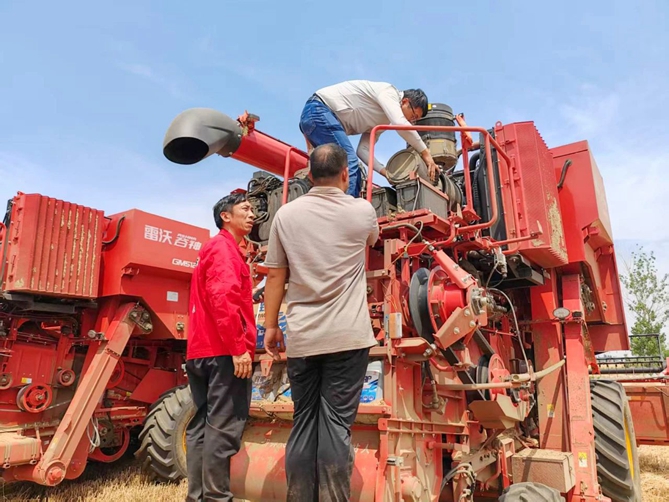 ▲甘肅麥客王建軍的收割機突報故障,濰柴工程師第一時間趕到現場查找解決問題。