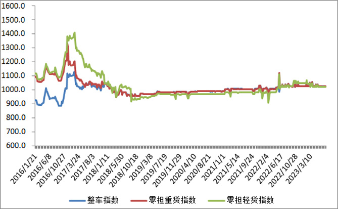 分車型看,各車型指數(shù)環(huán)比略微回升。其中,整車指數(shù)為1026.13點(diǎn),比上周回升0.01%;零擔(dān)輕貨指數(shù)為1020.21點(diǎn),比上周回升0.03%;零擔(dān)重貨指數(shù)為1025.21點(diǎn),比上周回升0.02%。