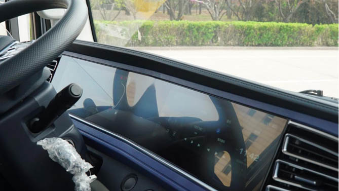 進(jìn)入車內(nèi),駕駛室的設(shè)計(jì)更是與傳統(tǒng)輕卡劃清界限。中控臺(tái)線條更像是家用MPV,造型十分大膽,而且還配備了雙聯(lián)大屏,屬于商用電動(dòng)車行業(yè)首配。10.25英寸全觸控屏不僅進(jìn)一步拉高內(nèi)飾顏值,而且內(nèi)置豐富車機(jī)功能,讓卡友的城配生活更加豐富多彩。