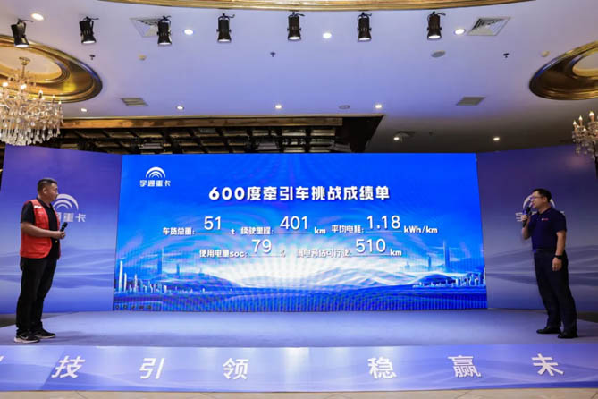 在發布會之前,宇通重卡600度牽引車進行了一次信心十足的實況續航挑戰。車輛在實況運輸場景下滿載51噸全程歷時10小時往返廣西賀州、梧州兩地,憑借一次充電輕松長續航的實力,最終以1.18度/公里的電耗表現完成401公里長續航挑戰,車輛使用SCO值為79%,滿電預估可行駛最長里程為510公里。真實場景、真測挑戰、現場公布成績,不僅展現出宇通600度牽引車的硬核實力,更展現出宇通重卡說到做到的價值承諾。