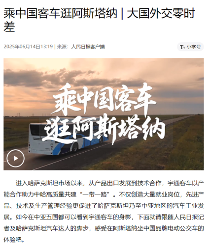 6月14日,《人民日報》再次發布重要文章,本次話題聚焦中國中亞深度互補、高度共贏的合作新格局。其中以《一輛客車,見證攜手打造綠色低碳新增長點》為題重點講述了宇通在中國中亞綠色創新合作中的重要貢獻。