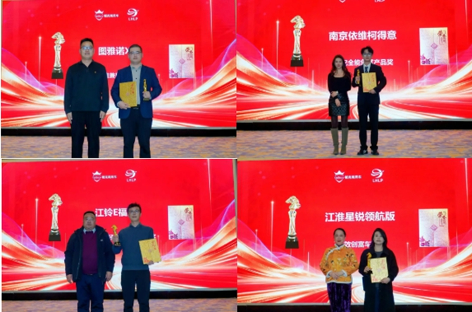 圖雅諾X5 獲得多能兼用產(chǎn)品獎,南京依維柯得意獲得城配全能創(chuàng)富產(chǎn)品獎,江鈴E福順獲得年度新能源輕客影響力品牌獎,江淮星銳領(lǐng)航版獲得高效創(chuàng)富車型獎。