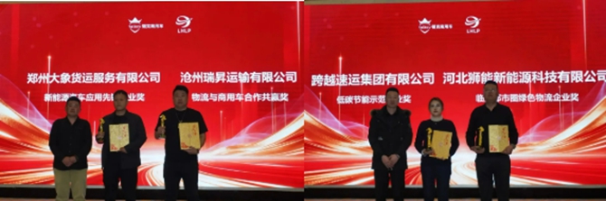 鄭州大象貨運服務(wù)有限公司獲得新能源汽車應(yīng)用先鋒企業(yè)獎,滄州瑞昇運輸有限公司獲得物流與商用車合作共贏獎,跨越速運集團有限公司獲得低碳節(jié)能示范企業(yè)獎,河北獅能新能源科技有限公司獲得臨港都市圈綠色物流企業(yè)獎。
