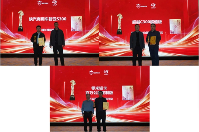 陜汽商用車智云S300獲得超長續(xù)航獎,超越C300超值版獲得最佳性價比城配物流車型獎,零米輕卡百萬公里定制版獲得百萬公里可靠性標桿獎。