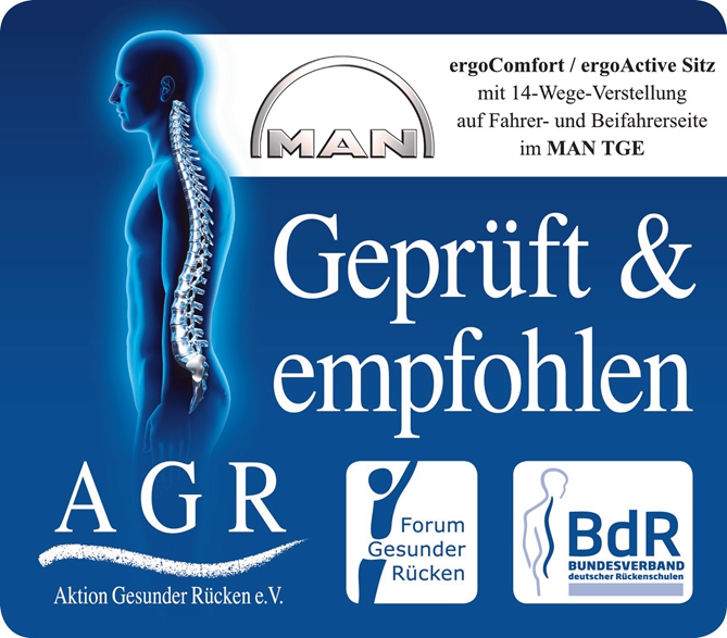 對于卡車駕駛員來說,長時間的駕駛是家常便飯。由此而來的腰酸背痛、腿部酸麻、頭痛等等身體不適都會影響到他們的工作狀態,因此一個舒適的座椅顯得尤為重要。作為脊背健康產品的“推薦大師”,德國脊背健康協會(AGR)對曼恩TGE上搭載的懸浮座椅“ErgoActive”和對乘客脊椎健康友好的“ErgoComfort”給予了認證。