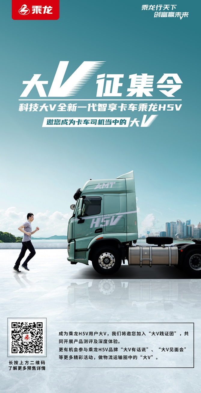 享預售福利,做“用戶大V”!掃描下方二維碼,馬上訂購乘龍H5V,搶先體驗乘龍全新產品,開啟屬于卡友自己的V時代,做物流運輸圈中的“大V”。