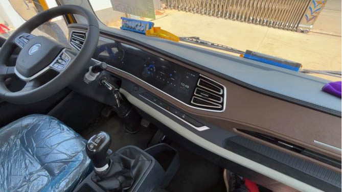 在當下商用車行業(yè)普遍追求智能化的背景下,整車的交互體驗做得相當?shù)轿唬?0.25寸液晶儀表+多媒體大屏的雙聯(lián)屏設(shè)計,提升了駕駛艙的科技氛圍和信息集成度。其中液晶儀表可顯示車輛狀態(tài)、保養(yǎng)提示及故障診斷信息,便于駕駛員即時掌握車輛工況。智能語音控制系統(tǒng)可操作空調(diào)、多媒體等,減少了駕駛員在行車過程中的手動操作,有助于提升行車安全性。