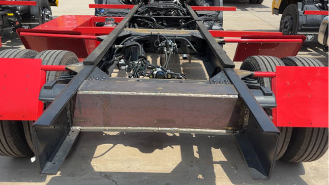 整車采用215*65*(6+4)結(jié)構(gòu)直通式雙層車架,匹配前8后10+6片的高承載板簧,以及加強型輪胎與十萬公里免維護后橋,為整車提供了執(zhí)行重載清障任務(wù)的堅實基礎(chǔ)。860mm的較低貨臺高度,以175cm左右的平均身高來看,僅到腰部以下的位置,有利于上裝設(shè)計和降低作業(yè)重心,同時方便卡友拿取設(shè)備,提升穩(wěn)定性。